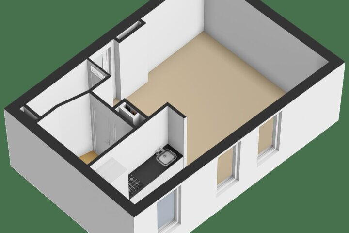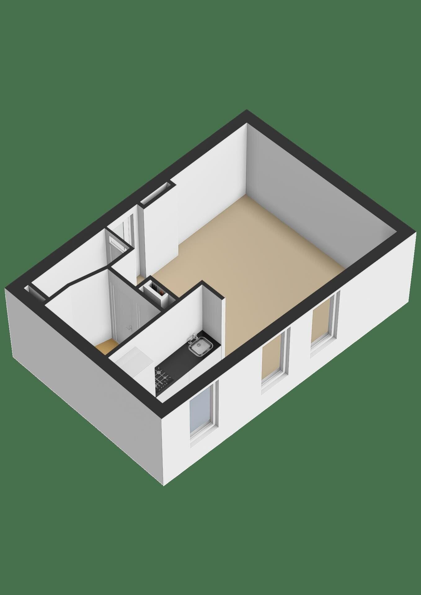 De entree van de studio bevindt zich op de derde verdieping. De meterkast is gelegen in het gemeenschappelijke trappenhuis. Via de entree stap je direct de lichte woon-/eetkamer binnen. Dankzij de drie ramen aan de voorzijde valt er veel daglicht naar binnen, wat de ruimte extra prettig maakt.